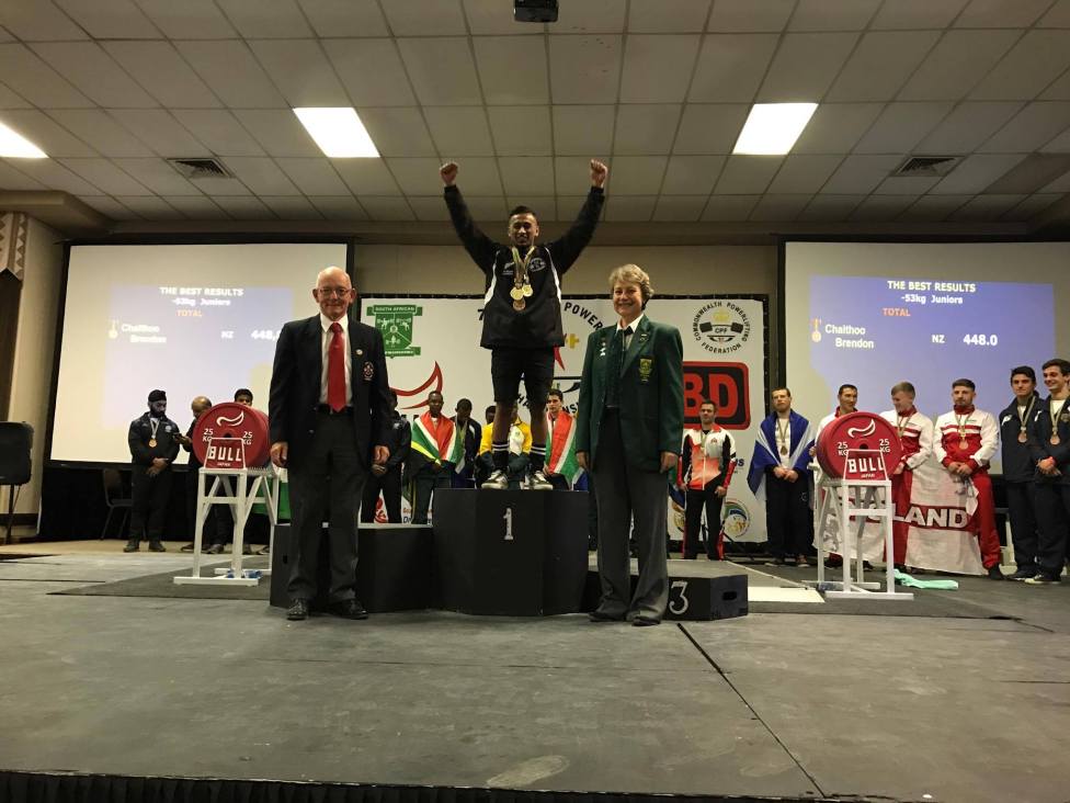 Weighed in at a massive 51.25kg’s and feeling great. First up squat, the opener at 145kg’s and that went up with ease, second attempt 155kg’s (just over 3 times bodyweight) which moved with a constant speed and didn’t give him too much trouble, but it made him work for it. Third attempt we go for the Commonwealth record of 160.5kg’s, which unfortunately did not happen. Just not strong enough on the day, he will crack that soon. He was disappointed in not getting that lift but he had to gather himself and focus on bench which was next. Warm up feeling good and we open on 97.5kg’s which was easy and got that three white lights and set the mark. Second attempt 102.5kg’s (double bodyweight), three white lights but again he worked for it. Third attempt we go for 107.5kg’s and he came out the groove and it got the better of him. Onto deadlifts and he is slowly fatiguing, the heat is defiantly not helping as well. So we warm up and get to 100kg’s and he’s back starts playing up. Now I can see the emotions in he’s face and he is starting to worry because this back issue has been bugging him for a while. I try my best to calm him down and the support from fellow Kiwi team mates were unbelievable. so we get our opener of 175kg’s ( 3.4 times bodyweight), out of the way and he was in pain. So we make the call and go straight for the Commonwealth record of 190.5kg’s (3.7 times bodyweight). We summoned every god possible for that lift and reminded him why he is there. He zoned out and numbed out from everything, he went up on that plat form and pulled with everything he had. Three white lights and new Commonwealth record. We had to scratch the third lift as he’s back was not playing ball at all. All in all it was the best he could have done on the day and come away with four gold medals, four national records, and two commonwealth records.